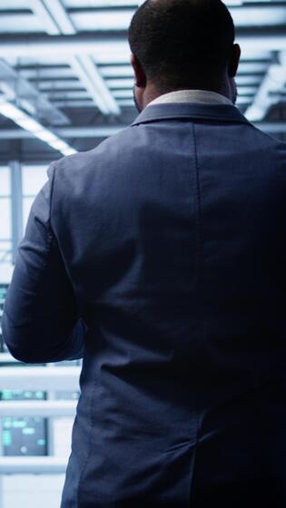 Vertical Technician monitoring server room supercomputers, doing checkup, inputting data on tablet of needed fixes. IT expert working in data center facility housing storage equipment, camera B Pro Video