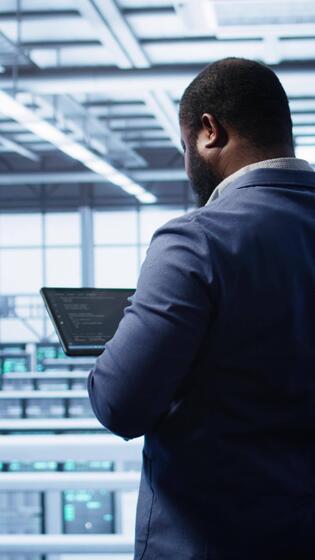 Vertical IT operator in server room workspace using tablet to patch network issues affecting transfer rates. Engineer in data center fixing errors affecting server rows rigs, camera B Pro Video