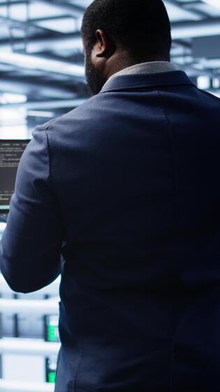 Vertical African american admin in data center running error checking utilities on tablet to fix hardware bugs. IT expert in server hub workspace looking for issues affecting mainframes performance, camera B Pro Video