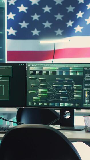 Vertical High tech governmental cyber operations center with USA flag. Network security, cyber defense and global surveillance to protect national security. Hacking tools for digital defense. Camera A. Pro Video