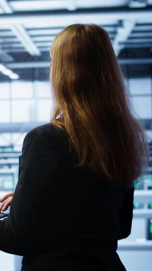 Vertical System administrator in server farm using laptop to patch network issues leading to slow data transfer rates. IT support staff member in data center fixing errors affecting supercomputers, camera B Pro Video