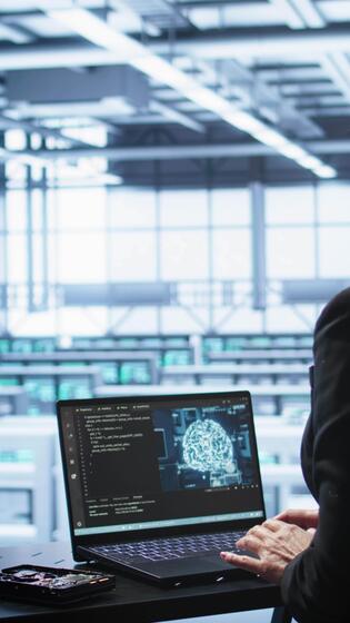 Vertical Engineer in data center using artificial intelligence computing simulating human brain thought processes in computerized model. Employee works on laptop with AI machine learning algorithms, camera B Pro Video