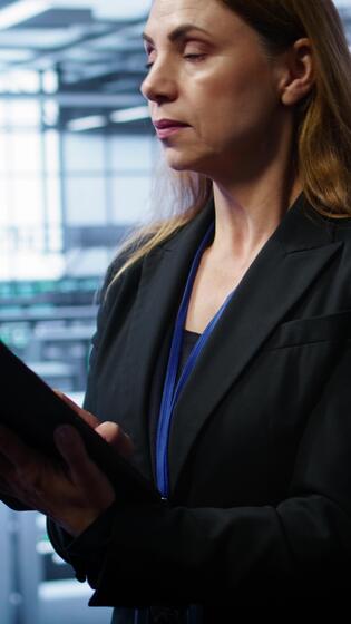 Vertical Admin in server room checks recovery plan on tablet, monitoring equipment energy consumption. IT professional uses notebook in data center workplace, ensuring rigs are functioning optimally, camera B Pro Video