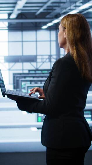 Vertical Technician doing yearly maintenance checkup using laptop to prolong data center hardware life span. IT specialist in server hub monitoring server infrastructure using notebook, camera B Pro Video