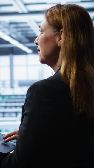 Vertical System administrator in server hub checking recovery plan on laptop, monitoring energy consumption. IT expert uses notebook in data center workspace, ensuring rigs are functioning optimally, camera B Pro Video