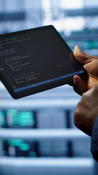 Vertical Engineer in high tech facility using tablet to patch network issues leading to slow data transfer rates. Close up of worker fixing errors affecting servers performance and connectivity, camera A Pro Video