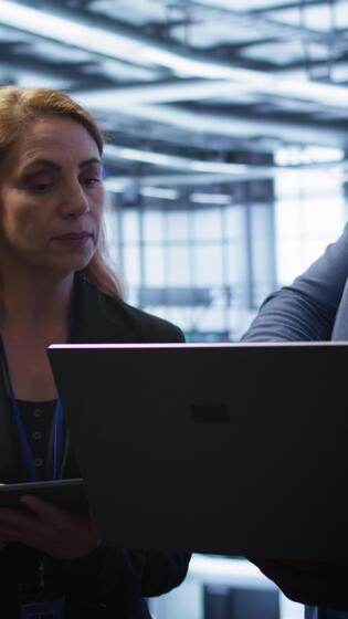 Vertical Team of IT specialists managing data center with advanced technology using devices. Coworkers in server room optimizing data center hardware equipment with laptop and tablet, camera B Pro Video