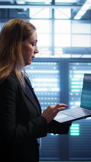 Vertical Woman walking in high tech facility, using laptop to patch network issues leading to slow data transfer rates. Employee in data center fixing errors affecting servers performance, camera B Pro Video