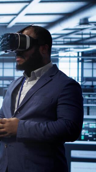 Vertical African american developer immersed in virtual reality at data center, doing units maintenance. Technician using VR headset to optimize servers performance, checking operations, camera A Pro Video