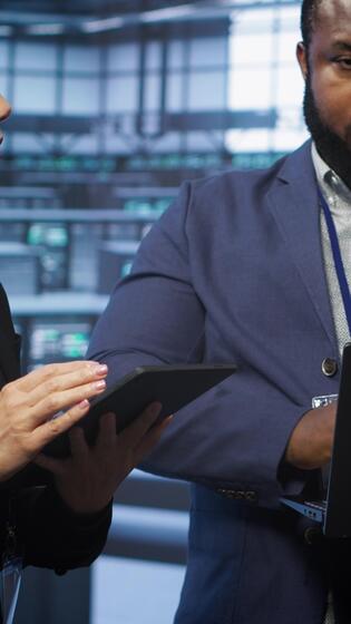 Vertical Teamworking technicians managing data center with advanced technology using devices. Coworkers in server room optimizing data center infrastructure with laptop and tablet, camera A Pro Video