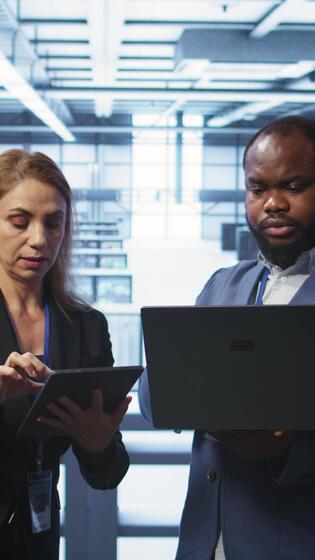Vertical Manager in data center supervising worker running error checking utilities to fix errors. Supervisor in server farm overseeing engineer repairing network issues affecting rigs performance, camera B Pro Video