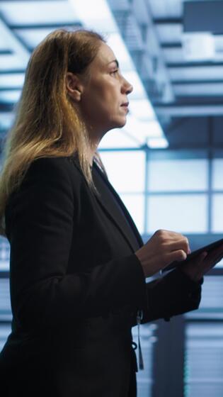 Vertical Engineer in server hub checking recovery plan on tablet, monitoring rackmounts energy consumption. Woman in data center making sure rigs are functioning optimally, doing routine disk checks, camera A Pro Video