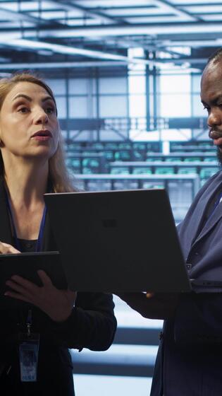 Vertical Manager in data center supervising worker running error checking utilities to fix errors. Supervisor in server farm overseeing engineer repairing network issues affecting rigs performance, camera A Pro Video