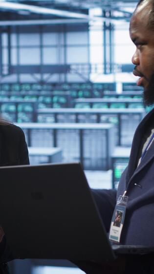 Vertical Teamworking colleagues in server farm using laptop to patch network issues affecting transfer rates. Coworkers in data center doing brainstorming, fixing errors affecting supercomputers, camera A Pro Video