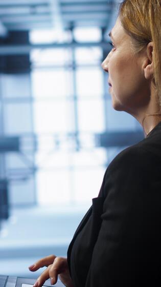 Vertical System administrator in data center typing on laptop, running error checking utilities to fix problems. Woman in server hub looking for network issues affecting rigs using notebook device, camera A Pro Video