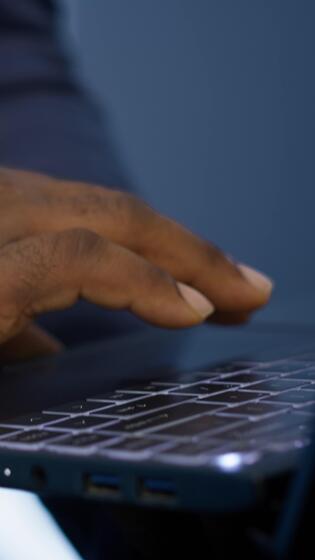 Vertical IT technician working on notebook in data center, overseeing server operations. Extreme close up shot of man ensuring optimal performance and data integrity in server hub, camera A Pro Video