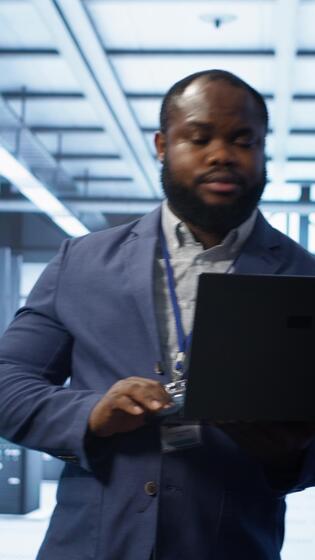 Vertical IT engineer working on laptop in modern data center, overseeing server operations, system maintenance,and cybersecurity protocols, ensuring optimal performance and data integrity, camera A Pro Video