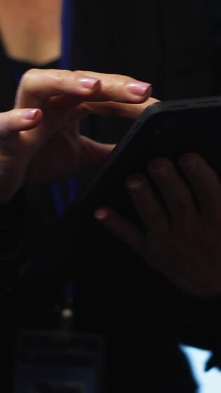 Vertical Programmer managing data center with advanced technology using digital device. Close up shot of woman walking in server room, optimizing data center tech with tablet, camera A Pro Video