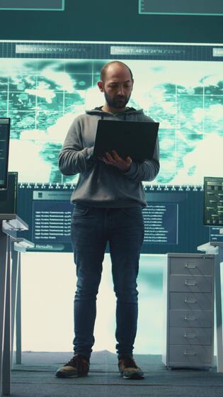 Vertical Hackers group using ransomware and phishing tactics to compromise computer networks and gather intelligence for national security and protection during cyberwarfare. Governmental spyware. Camera B. Pro Video