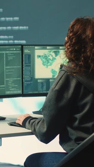 Vertical Group of governmental hackers using hacking tools to secure a network, focusing on cyber defense and data protection measures. Experts team examining important information on big screen. Camera A. Pro Video