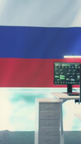 Vertical Empty cyber security room big screen running Russian flag, representing hybrid war and cyber terror. Highlighting unauthorized access, espionage and Russian hackers defamation tactics. Camera B. Pro Video
