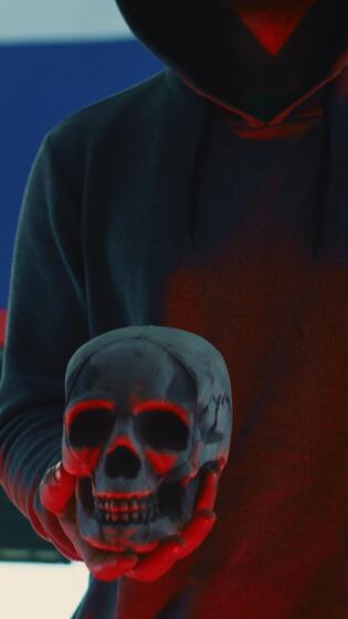 Vertical A maniacal russian hacker creating cyber threat alert by holding a skull as concept of cyber espionage and malicious code. Illustration warning of cyber security risks, evil harmful scam. Camera A. Pro Video
