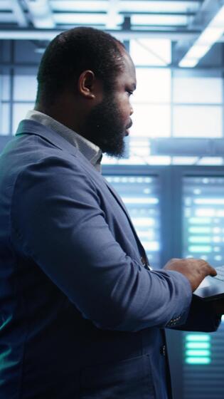 Vertical Technician in data center workspace running system diagnostic tests and error checking utilities to fix issues. Employee looks for network issues affecting rigs performance and connectivity, camera B Pro Video