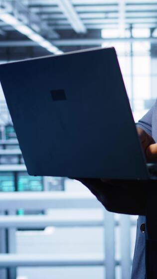 Vertical Computer scientist in high tech facility using laptop to patch network issues affecting server cabinets performance and connectivity, leading to poor client communication, camera B Pro Video