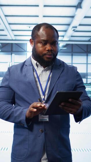 Vertical IT technician walking in data center, overseeing server operations using tablet. Expert ensuring optimal performance and data integrity in server hub using digital device, camera B Pro Video