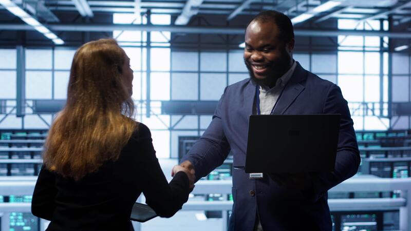 African american admin greeting inspector arriving in data center to supervise operations. IT expert in server hub workspace doing hand shake with supervisor monitoring performance, camera A Pro Video