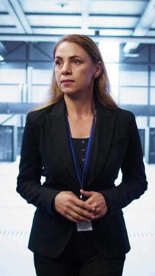 Vertical Manager inspecting server room gear, walking between mainframes. Woman doing evaluation of data center workspace, checking infrastructure, monitoring performance, camera B Pro Video