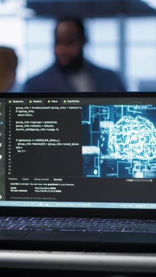 Vertical Focus on notebook used by engineers in server hub in blurry background using artificial intelligence computerized model. Close up of laptop with AI deep learning using pattern recognition, camera A Pro Video