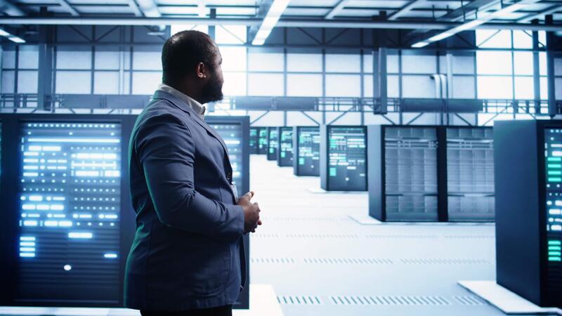 African american technician walking in data center, monitoring systems to identify errors. Man in server hub location doing diagnosis, looking for infrastructure bugs in need of repairing, camera B Pro Video