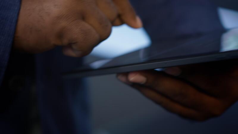 Software developer doing yearly maintenance using tablet to prolong data center equipment life span. Extreme close up of worker in server hub monitoring server infrastructure using device, camera A Pro Video