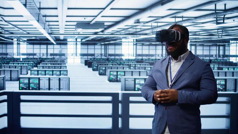 African american developer immersed in virtual reality at data center, doing units maintenance. Technician using VR headset to optimize servers performance, checking operations, camera B Pro Video