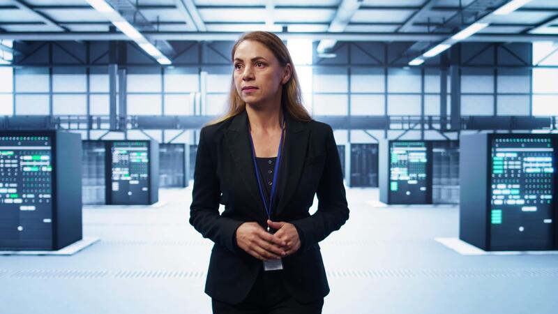 Manager inspecting server room gear, walking between mainframes. Woman doing evaluation of data center workspace, checking infrastructure, monitoring performance, camera B Pro Video