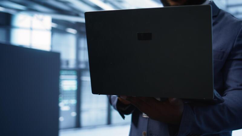 Technician in server hub using laptop to patch network issues leading to slow data transfer rates. Close up of IT professional in data center fixing errors affecting supercomputers, camera B Pro Video