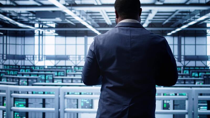 Technician monitoring server room supercomputers, doing checkup, inputting data on tablet of needed fixes. IT expert working in data center facility housing storage equipment, camera B Pro Video