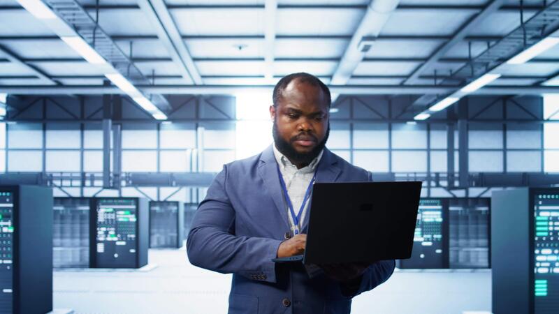 Computer scientist in data center using diagnostic tools and system monitoring software on laptop to identify cause of errors. IT specialist in server farm establishment repairing equipment, camera B Pro Video