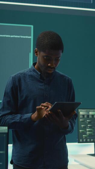 Vertical Cyber intelligence team defending against cyber threats and espionage. Governmental hacker using advanced technology to access information and secure networks, monitors high tech facility. Camera B. Pro Video