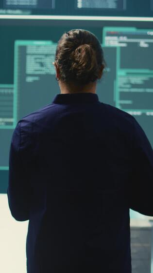 Vertical Governmental hackers at work planning advanced cyber attacks on servers infrastructure to gather intelligence, high tech spyware concept. Specialists hacking accounts for cyberwarfare. Camera B. Pro Video