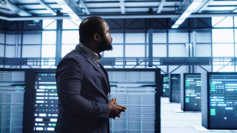Admin inspecting server farm equipment, walking between supercomputers. IT specialist doing evaluation of data center workspace, checking equipment, monitoring performance, camera A Pro Video