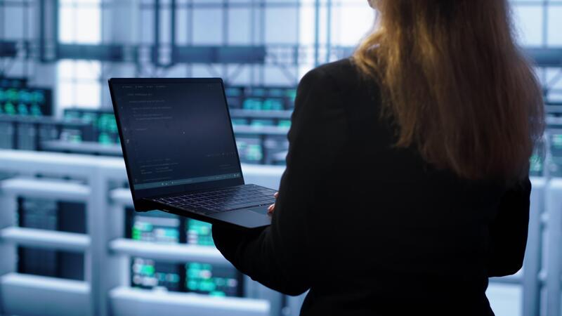 System administrator in server farm using laptop to patch network issues leading to slow data transfer rates. IT support staff member in data center fixing errors affecting supercomputers, camera A Pro Video