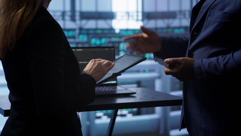 Team of admins in server room location installing newly ordered storage unit, close up. Coworkers in data center facility replacing storage rigs parts to improve performance, camera A Pro Video