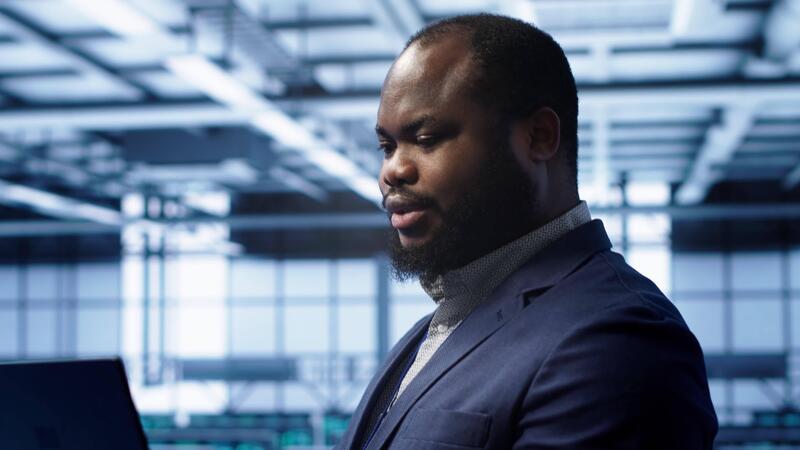 Admin in server farm using laptop to patch network issues leading to slow data transfer rates. Close up of IT specialist in data center workspace fixing errors affecting supercomputers, camera A Pro Video