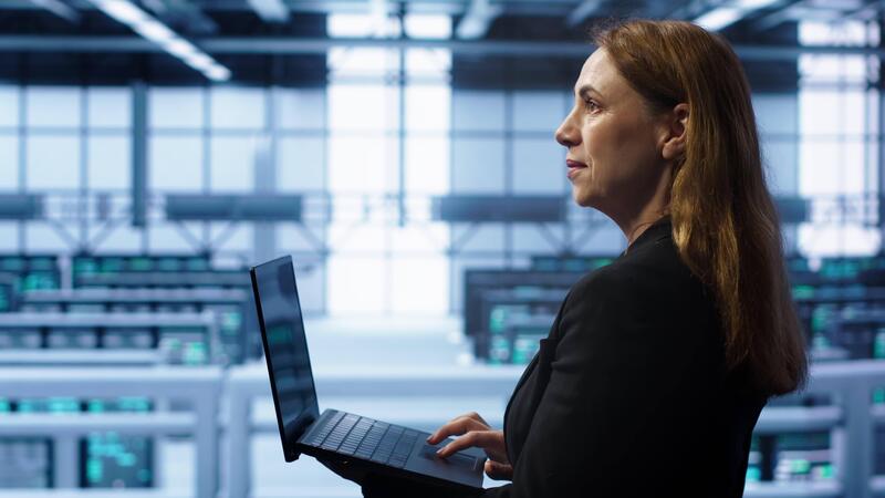 System administrator in server hub checking recovery plan on laptop, monitoring energy consumption. IT expert uses notebook in data center workspace, ensuring rigs are functioning optimally, camera A Pro Video