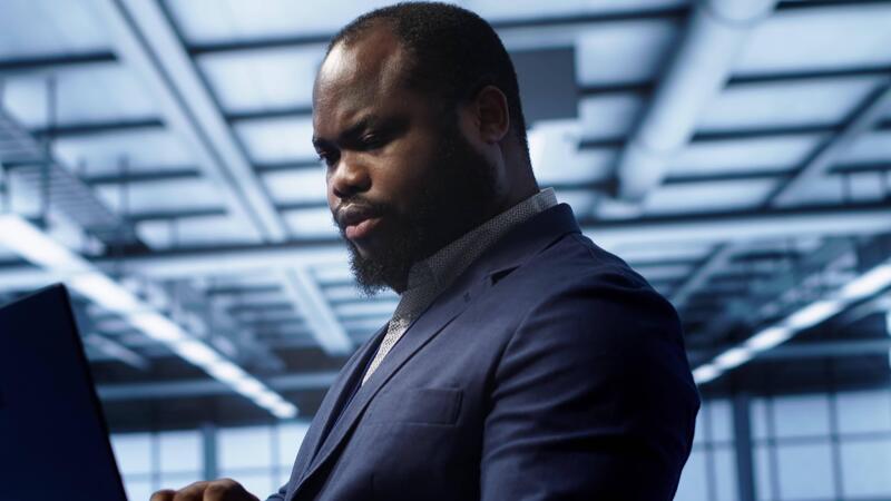 Computer scientist in high tech facility using laptop to patch network issues affecting server cabinets performance and connectivity, leading to poor client communication, camera A Pro Video