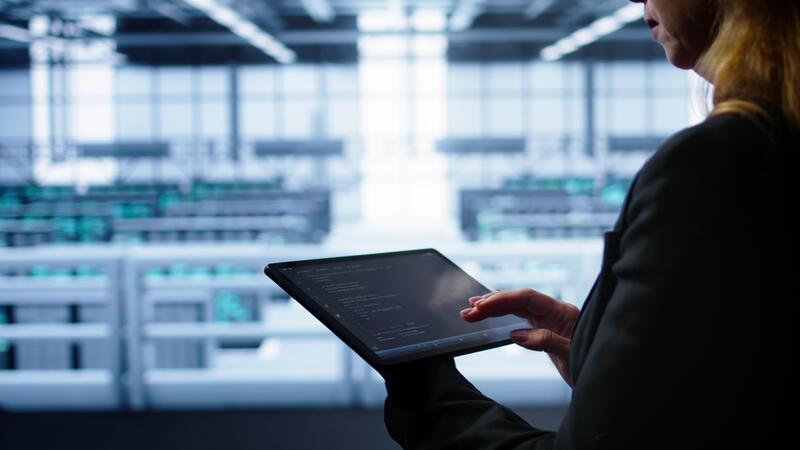 System administrator doing annual checkup using tablet to prolong data center equipment life span. Close up shot of IT expert in server hub monitoring supercomputers using digital device, camera B Pro Video