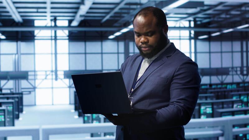 African american IT operator doing maintenance using laptop to prolong data center equipment life span. IT professional in server hub workspace monitoring server mainframes using notebook, camera A Pro Video
