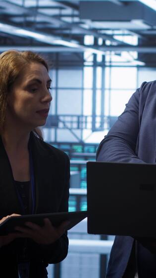 Vertical Team of IT specialists managing data center with advanced technology using devices. Coworkers in server room optimizing data center hardware equipment with laptop and tablet, camera A Pro Video